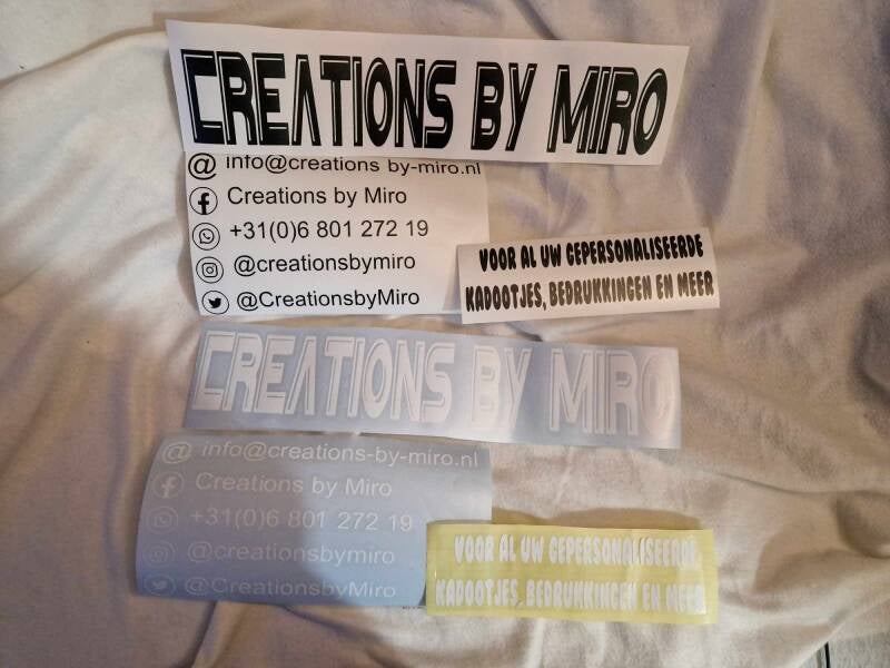 Ook voor bedrijfs merchandise bent u bij ons aan het juiste adres. Gaat het nu om een logo op een bedrijfs (auto), of voor het bedrukken van shirts e.d., ook hiervoor kunt u bij Creations by Miro terecht. Vul het Contact formulier in, en wij zullen zo spoedig mogelijk een reactie geven.